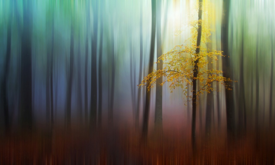 I admit that the idea for the final image was not in my mind the moment I took the photo of the tree with yellow leaves. A few months after I took that shot, I started to experiment with intentional camera movement (ICM) during exposure, and it just so happened that I was back in a wooded location. After creating a few vertical movement photos, I began to wonder how it might look with a combination of motion blur and a clear, sharp subject. Unfortunately, it was the start of summer so the forest didn’t look all that appealing. Then I remembered the photo shoot from the same location (back in autumn), so I started to look for a photo that had the right composition and coloring to suit this type of effect. I chose this photo specifically for the pop of yellow in the tree.