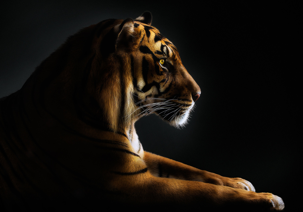 So I chose to make the portraits from a feasible (and safe) position and recreate the studio in the edition phase.  I started experimenting, and I realized that in the end the result was better, because the animal behaved naturally when not forced to be in a studio. Studio work often frightens or stresses the animal, and the result is a portrait of a harassed creature.  So what was initially a constraint ended up becoming an advantage. The animal is often unaware that he's being photographed, or if it is, eye contact is made, but each one from his  own safe space. And I often try to get that eye contact, because that is where your consciousness is best perceived and a fascinating interaction develops. I then came to the conclusion that it is not worth forcing the animal to pose in a photographic studio just to get a dark background. If this can be done in post-production, there is no need to disturb it.