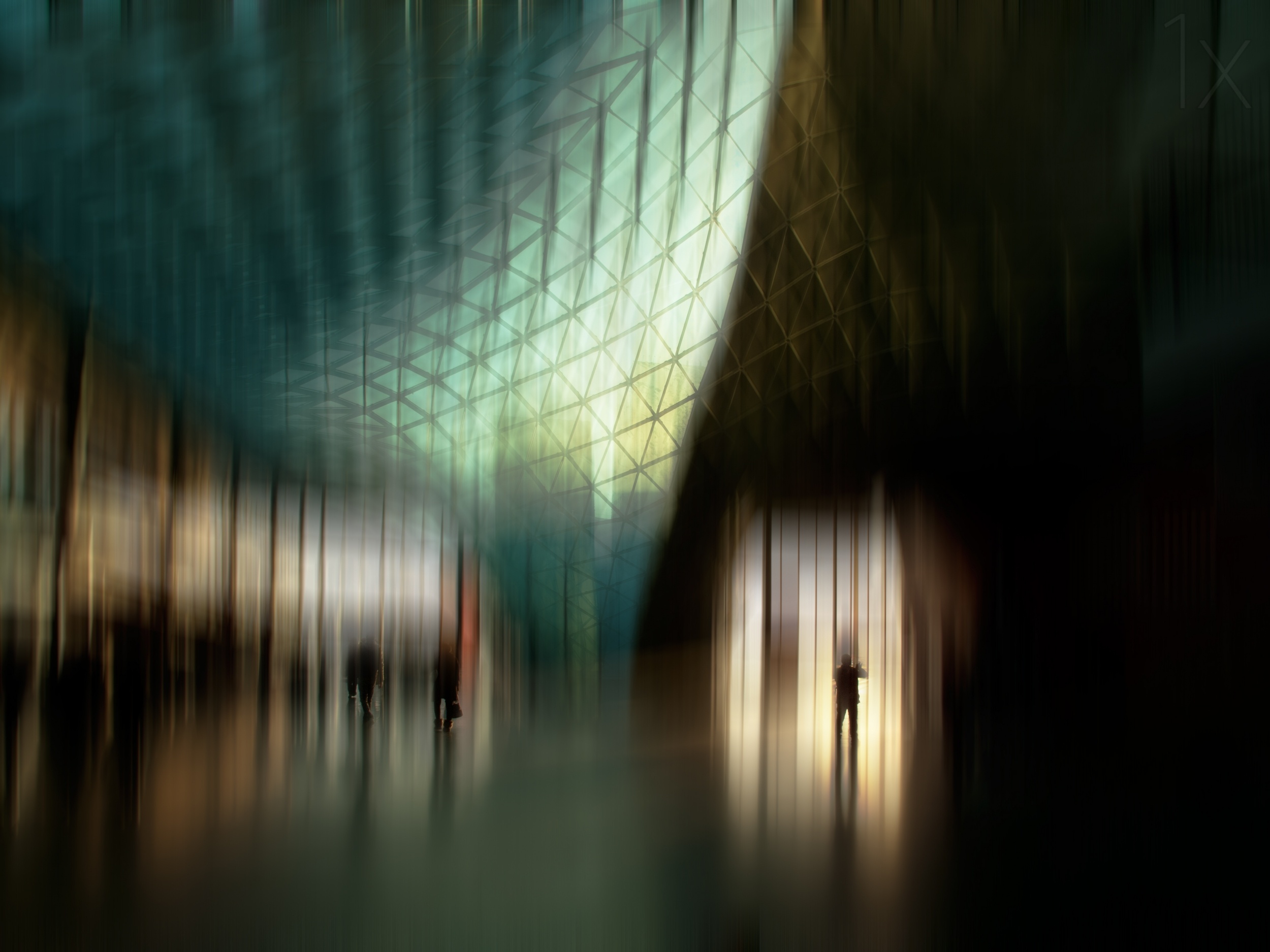 1) In Photoshop, I decided to first apply the Motion Blur filter (Filter > Blur > Motion Blur). It allowed me to hide the uninteresting parts of the image and to highlight the strengths of the image — the central gridded structure and the figures on the left and right sides of the frame. The central structure was the main feature, and the people were secondary. So I decided that the blur should start from the bottom-left of the frame, leaving just enough shape in the shadows to give an impression of the human figures there. I wanted to make sure that the group of people in the center was highlighted a bit, but I was most interested in leading the viewer's eye to the figure holding the bag and to the isolated person on the right. I made a copy of the background layer and applied the Motion Blur filter with Angle set to 90 degrees and Distance set to 350 pixels.